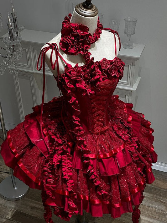 Red Roses Neckline Lolita Goth Boning Dress Sequins Tiered Ruffle Dress DP4068