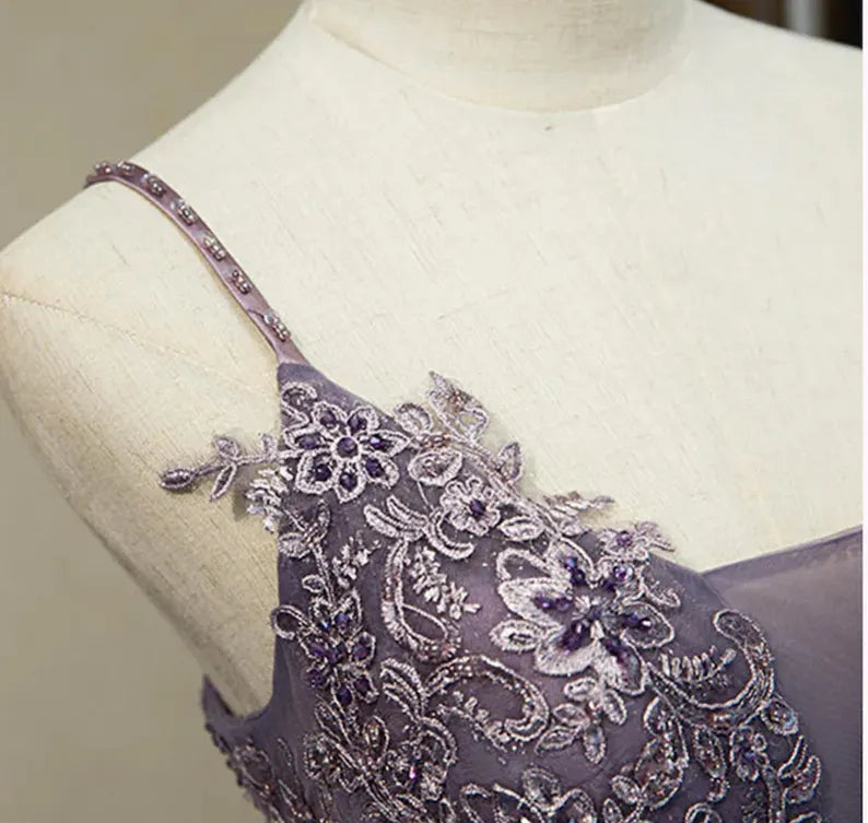 A Line Spaghetti Straps Appliques Ruffle Tulle Prom Dress DP1010