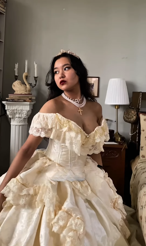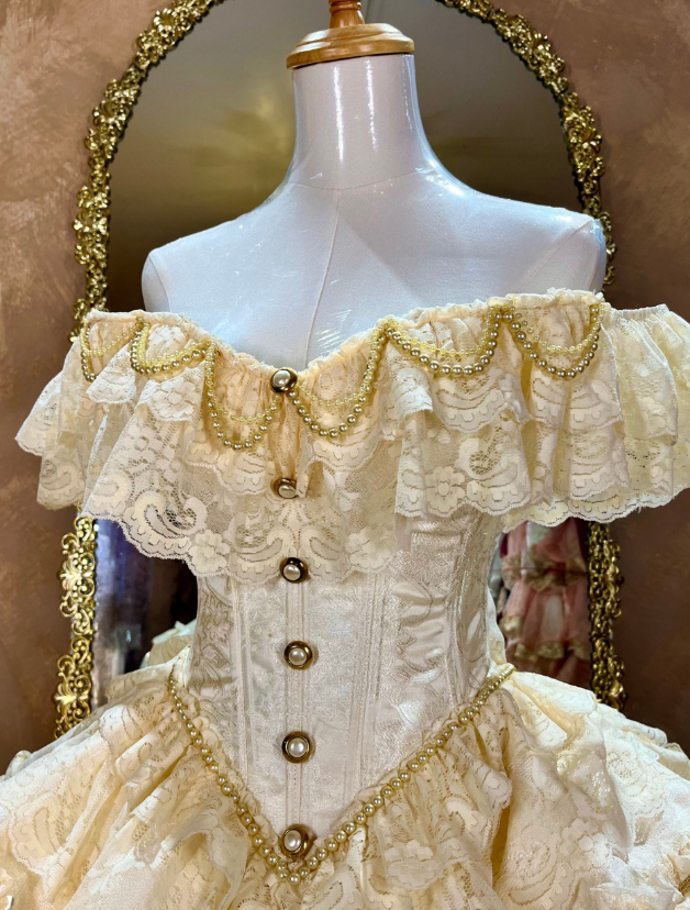 Apricot Ball Gown Off the Shoulder Layered Lace Satin 16th Birthday Dress Quinceanera Dress DP4439