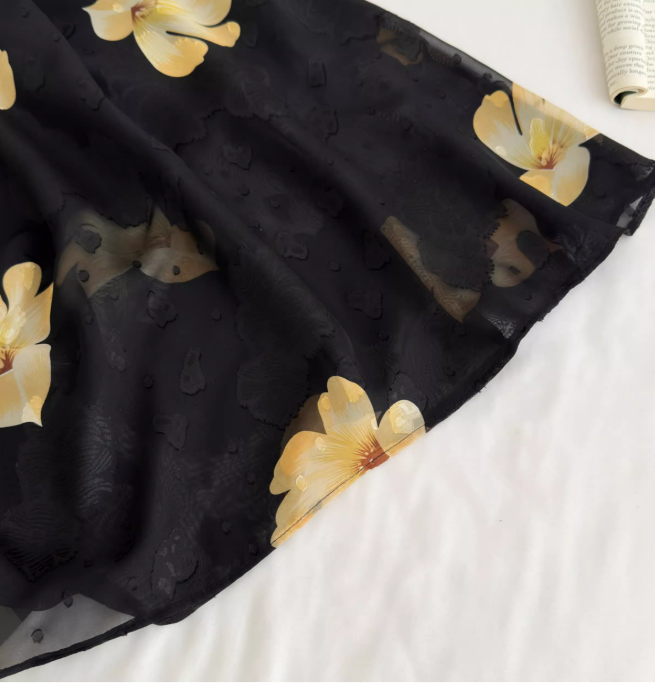 Black A Line Spaghetti Straps Yellow Floral Chiffon Vacation Dress Prom Dress Outfits DP3551