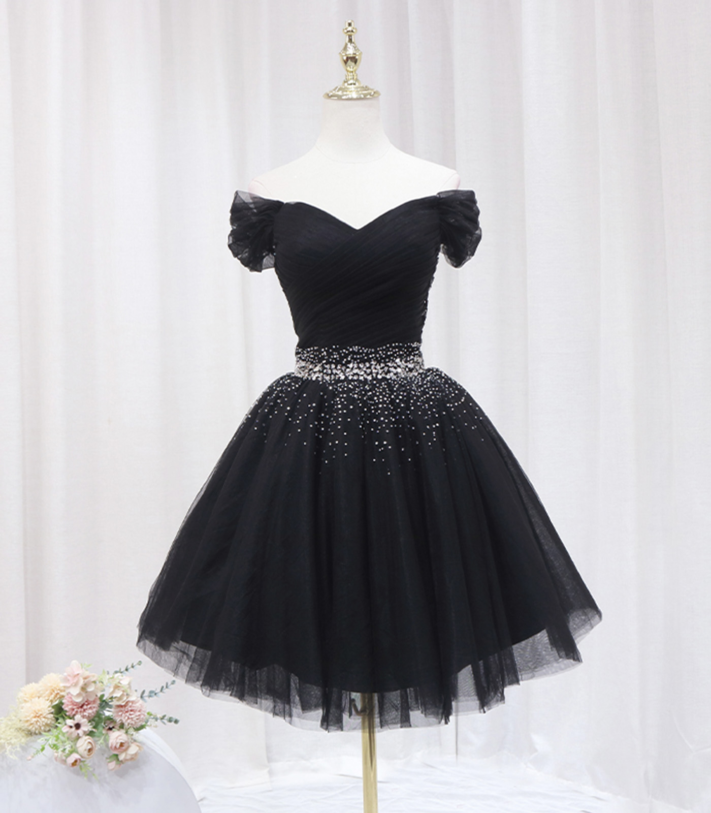 Black Off The Shoulder Tulle Beaded Short Prom Dress Homecoming Dress DP357