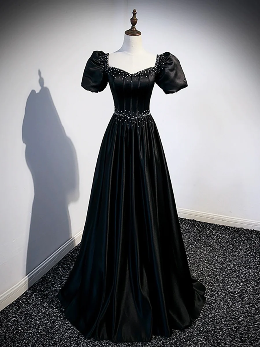 Black Satin Beaded Prom Dress A-Line Evening Dress DP258