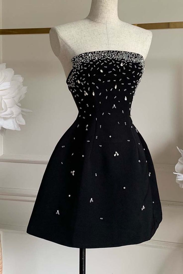 Black Vintage Strapless Beaded Short Prom Dress Homecoming Dress DP537