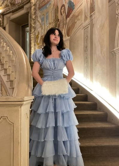 Blue A Line Puff Sleeve Layered Satin Organza Long Prom Dress Evening Dress DP1333