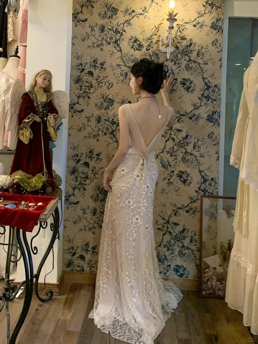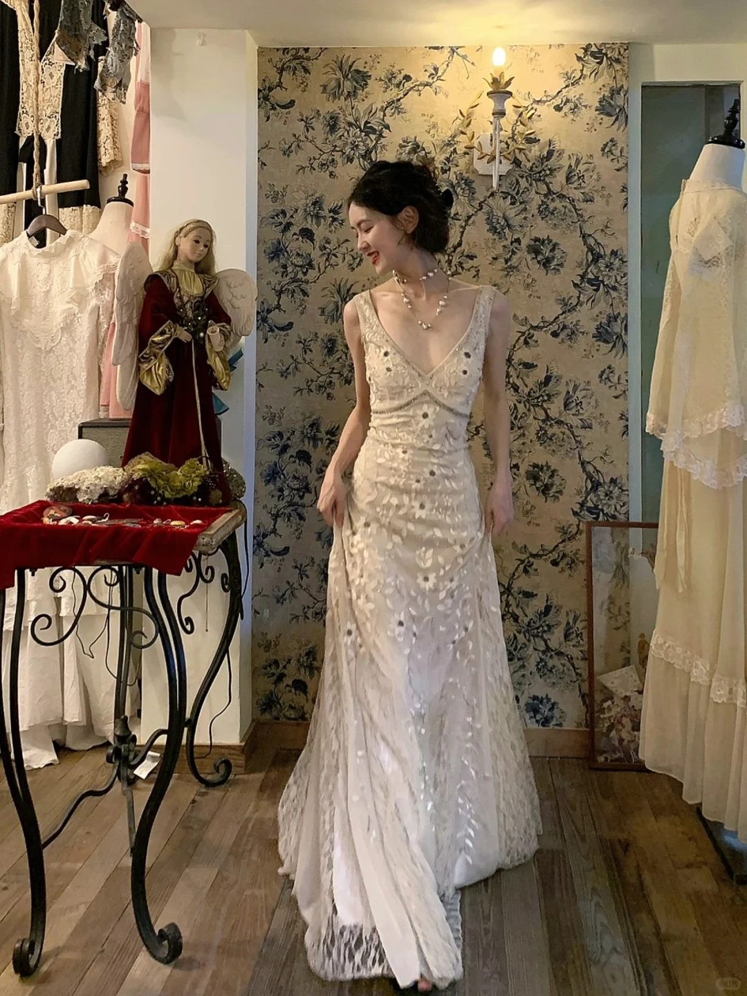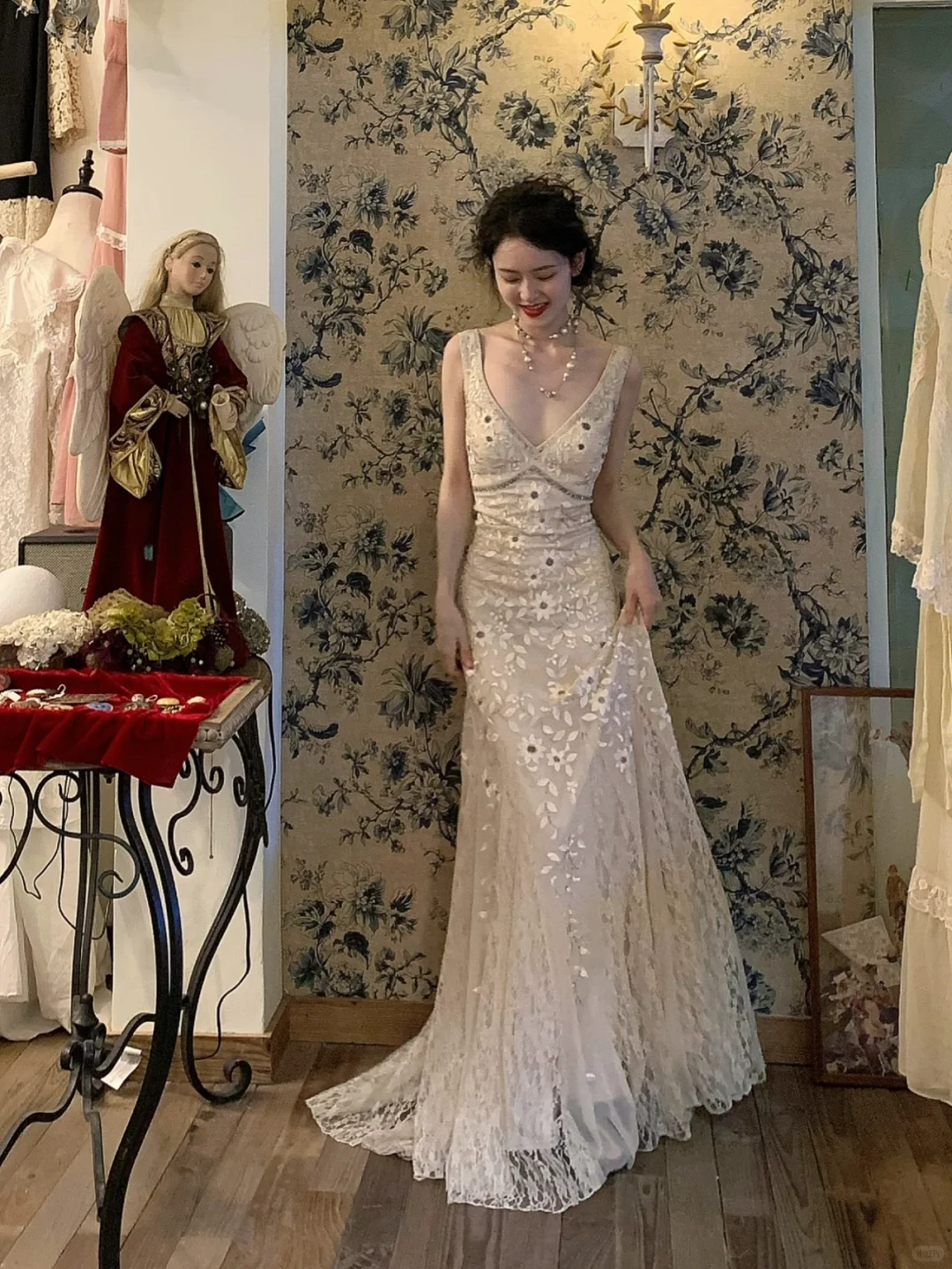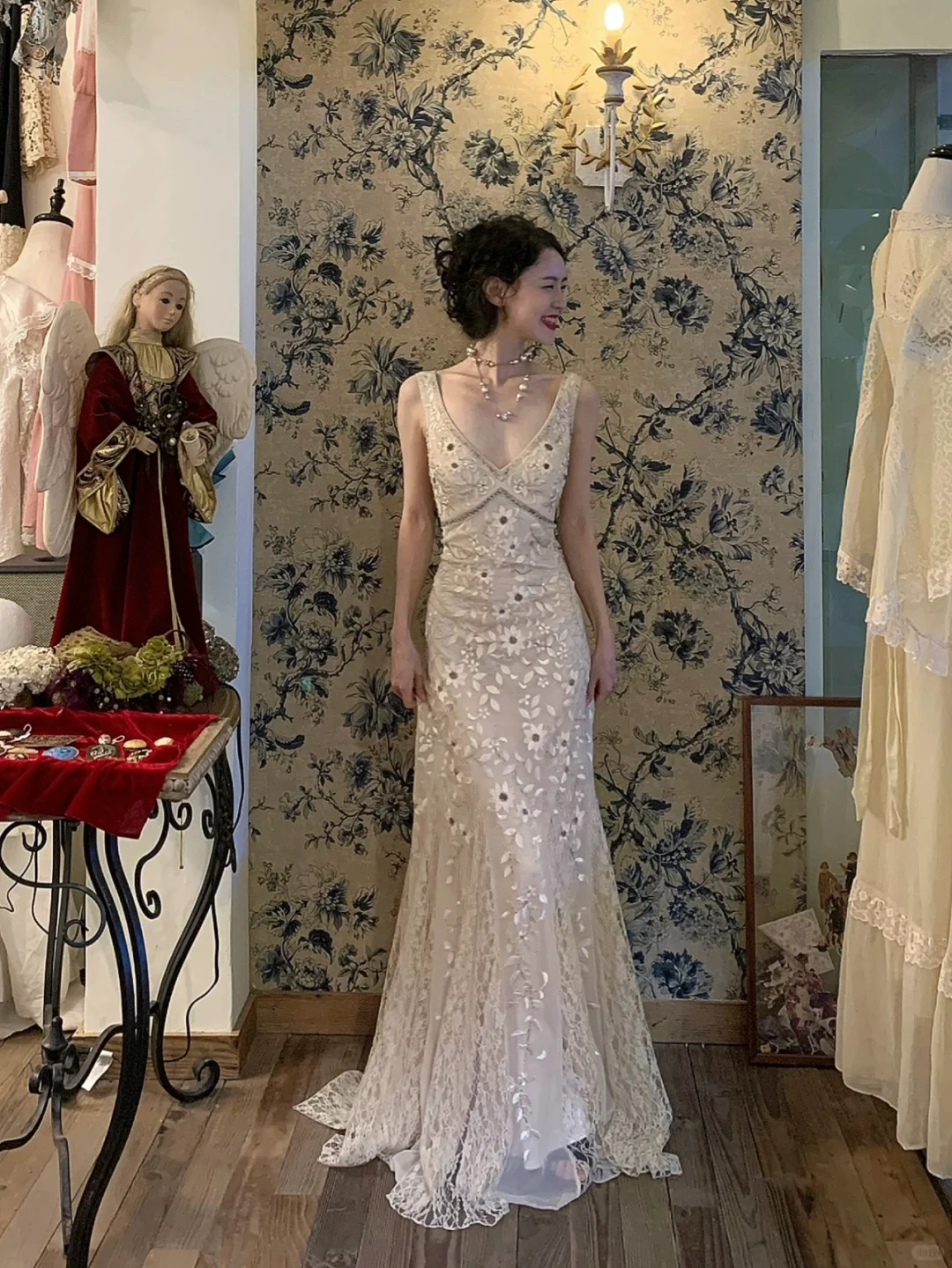 Gentle Mermaid V Neck Light Apricot Lace Prom Dress Party Dress DP3712