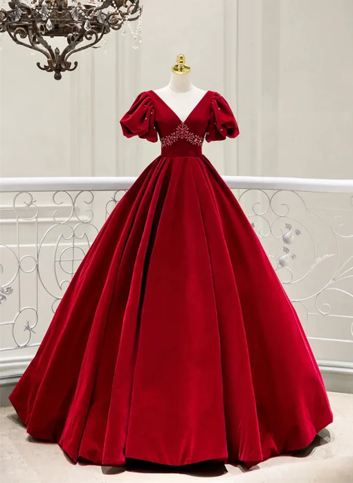 Burgundy Velvet Beaded Short Sleeves Party Dress Prom Dress DP606