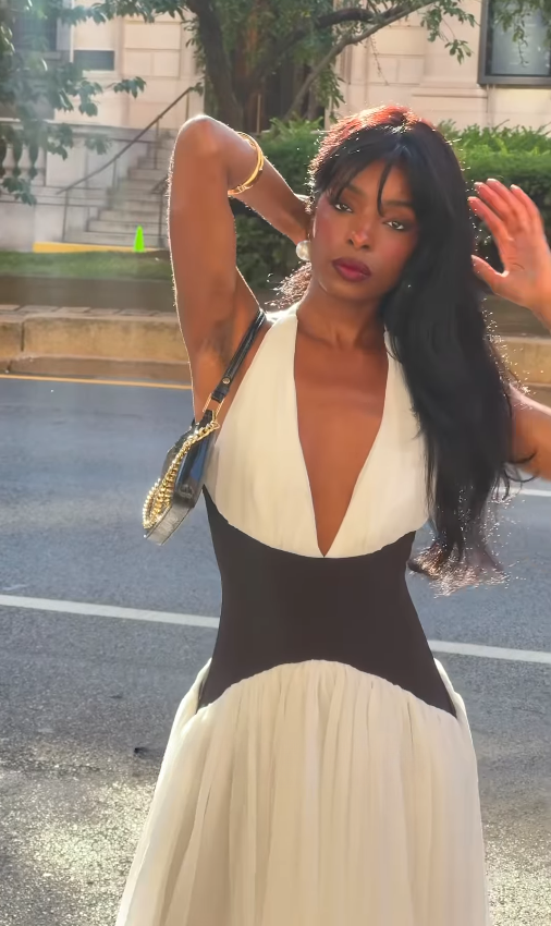 Classic Black-white A Line V Neck Satin Chiffon Prom Dress Outfits DP4377