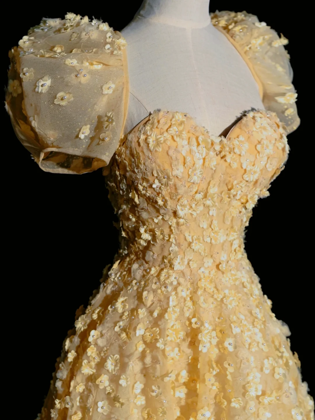 Cute A Line Puff Sleeve Yellow Flower Tulle Long Prom Dress Graduation Prom Dress DP2142