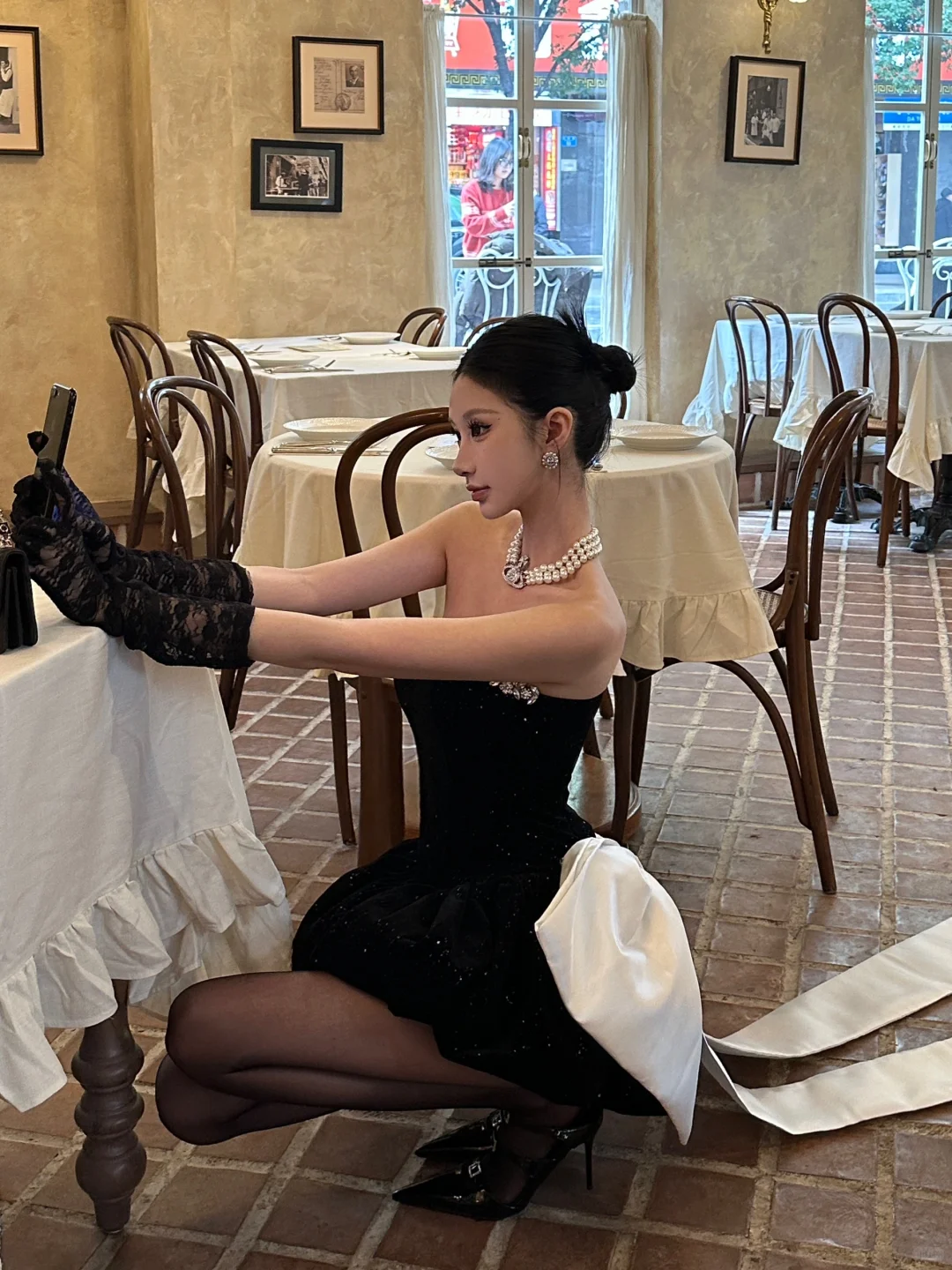 Cute A Line Sweetheart Neck Rhinestone Black Sequin Homecoming Dress with Bow DP2697