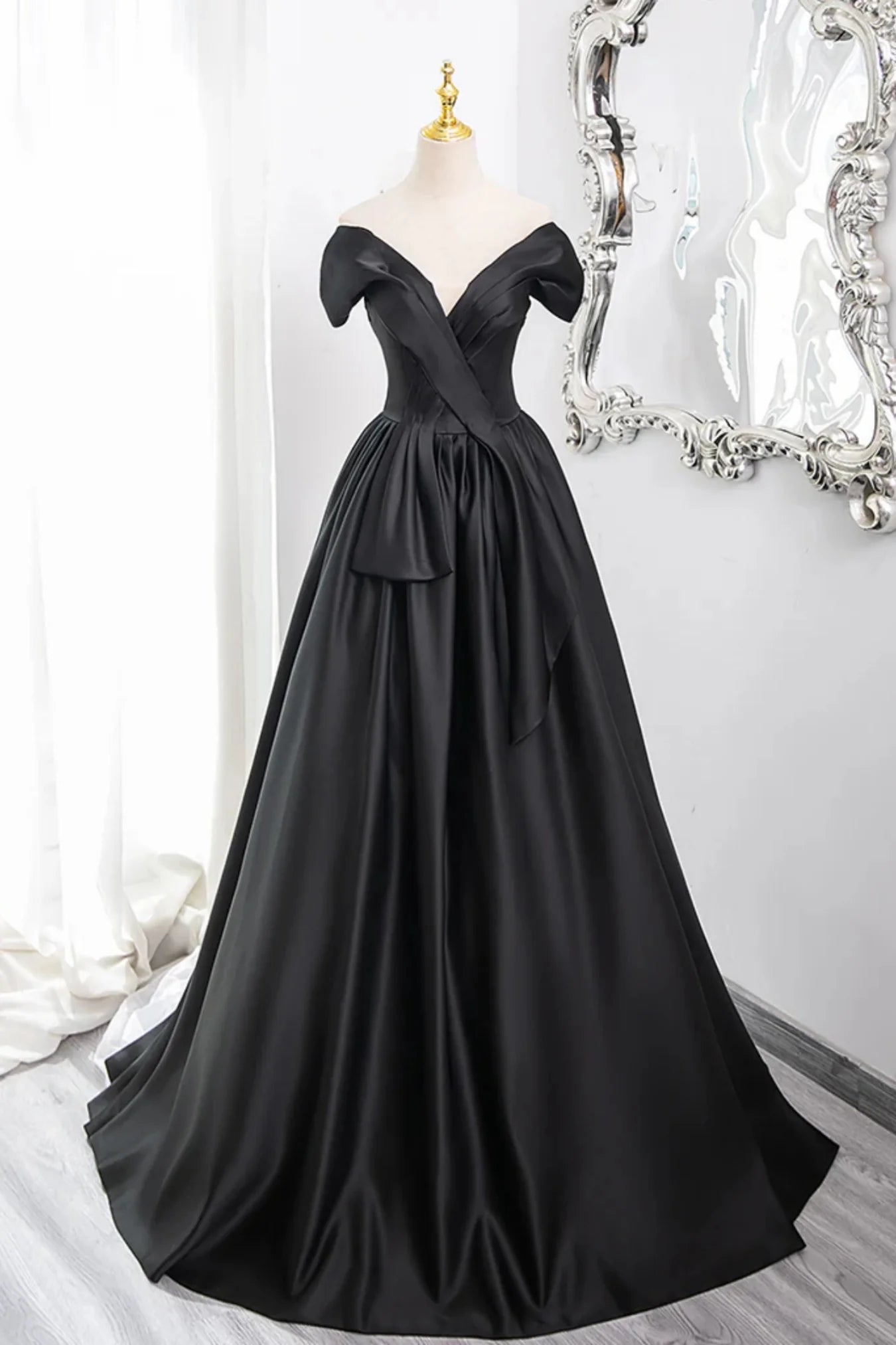 Elegant A Line Off the Shoulder Black Satin Long Prom Dress Evening Dress DP1302