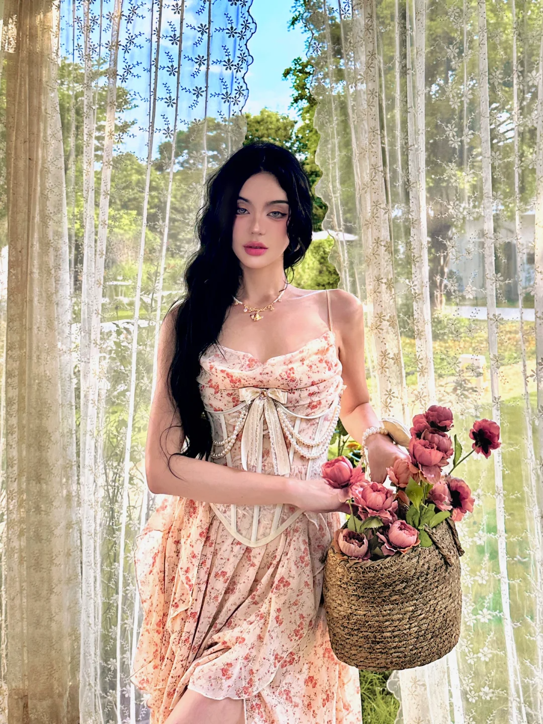 Gentle A Line Spaghetti Strap Print Floral Chiffon Long Prom Dress Party Dress DP3964