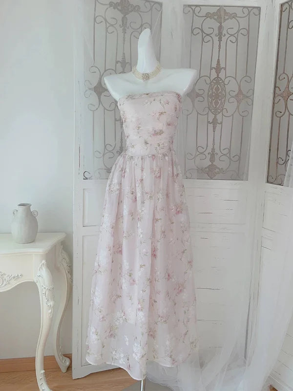 Light Pink A Line Strapless Floral Chiffon Prom Dress Evening Dress DP1305