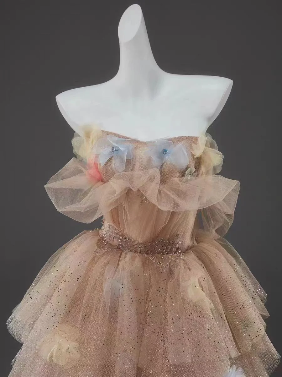 Luxurious A Line Strapless 3D Flower Layered Sequins Tulle Ball Gown Prom Dress DP1365