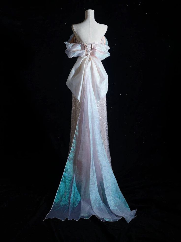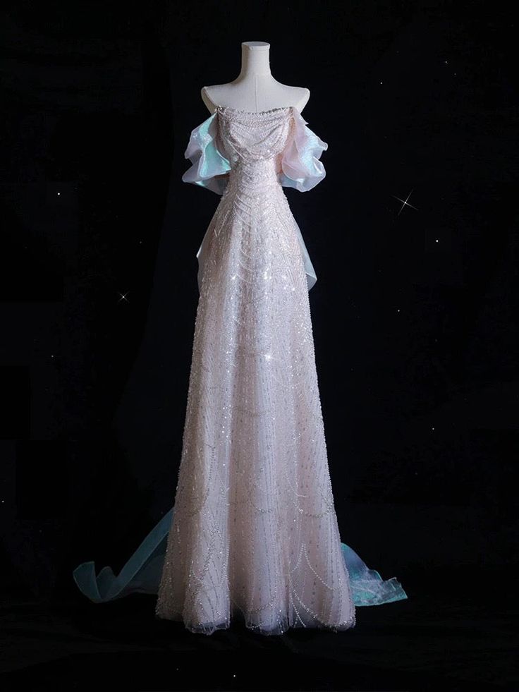 Pink Pretty A Line Off the Shoulder Pearl Sequin Tulle Prom Dress Party Dress DP3067
