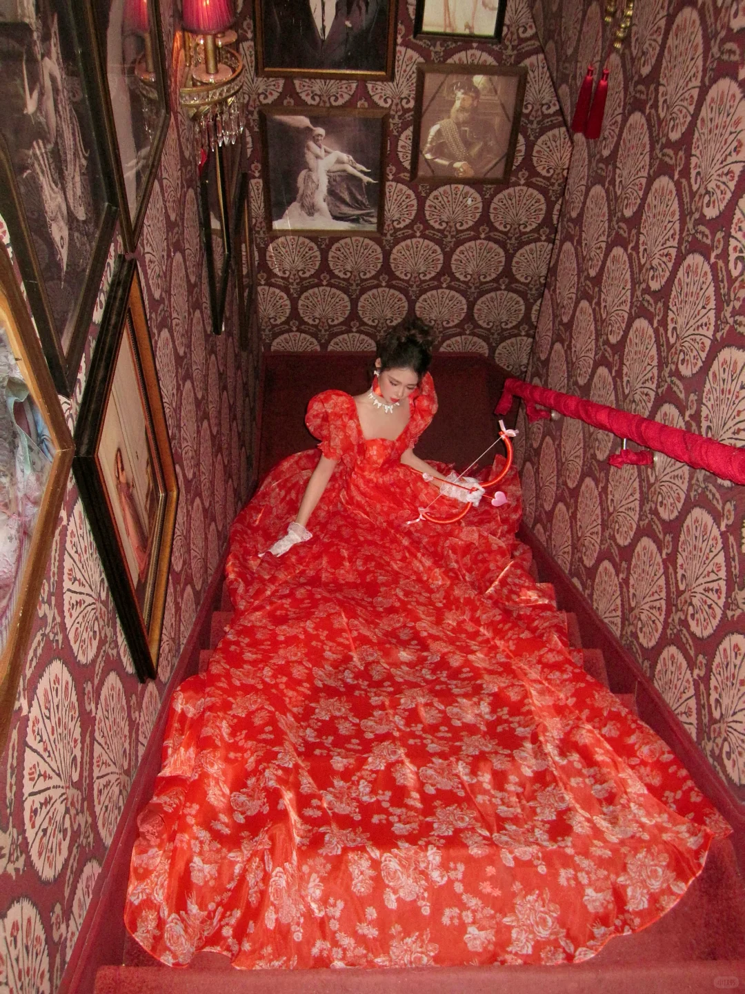 Red Ball Gown Puff Print Floral Ruffle Chiffon Long Party Dress Birthday Dress with Slit DP2523