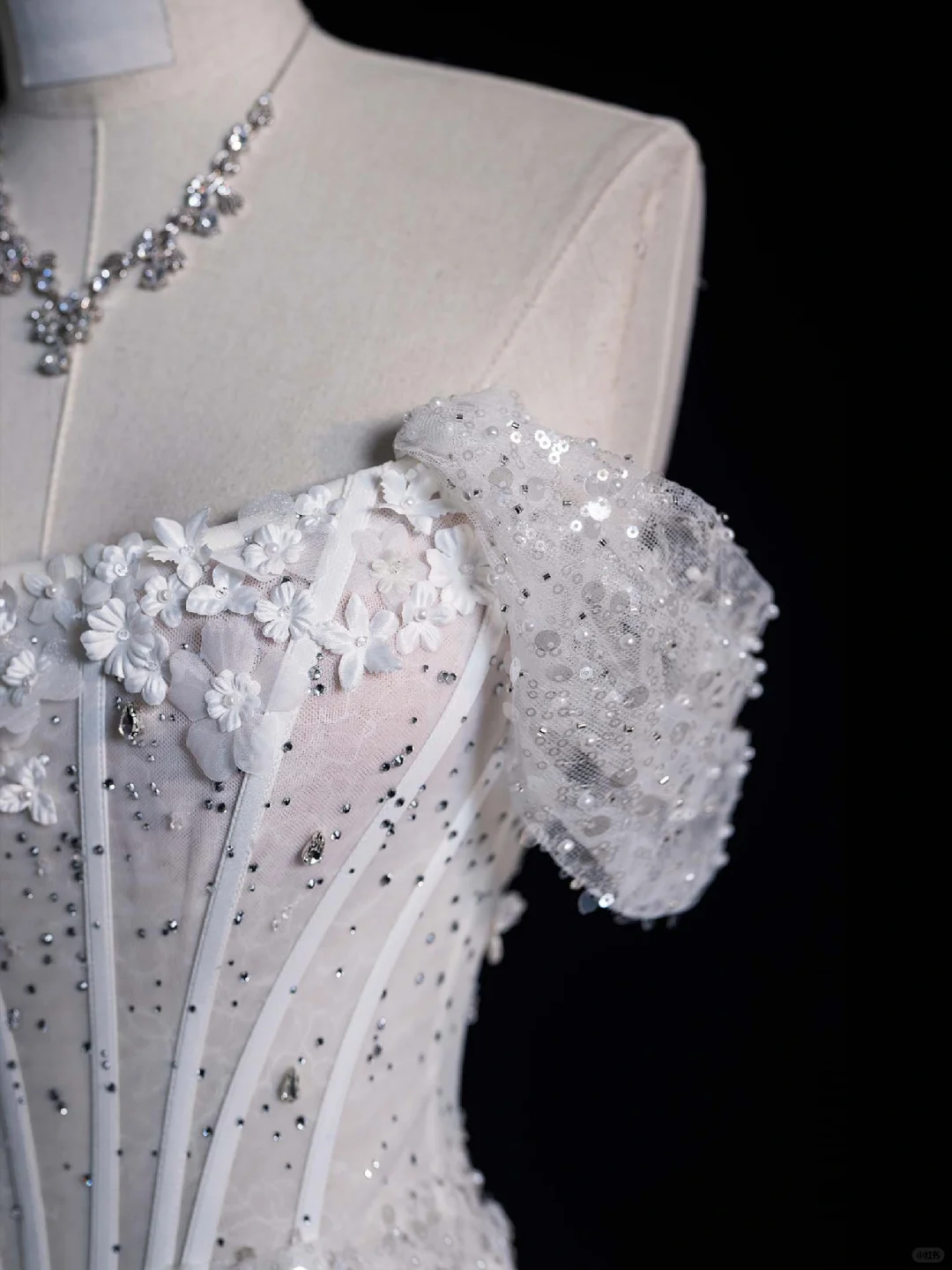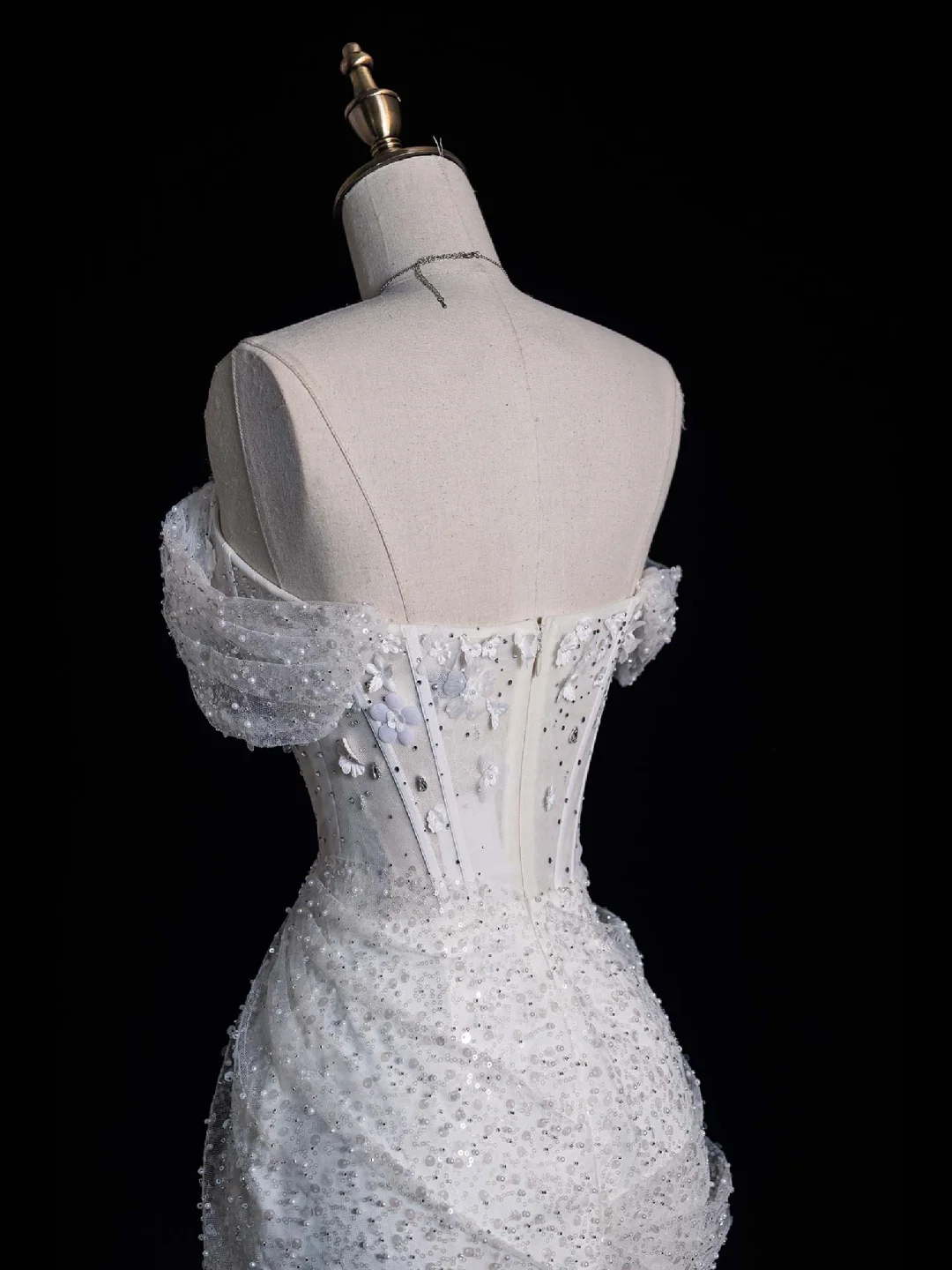 Shiny Mermaid Off the Shoulder Sequin Flower Rhinestone White Tulle Long Evening Dress Party Dress DP2298