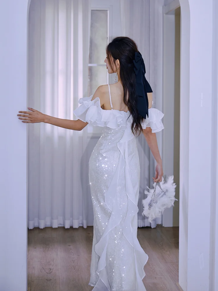 Shiny Mermaid Spaghetti Strap Ruffle Sequin Prom Dress Party Dress DP2514