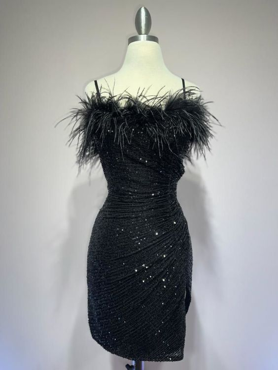Spaghetti Straps Sheath Black Sequin Feathers Homecoming Dress Cocktail Dress DP356