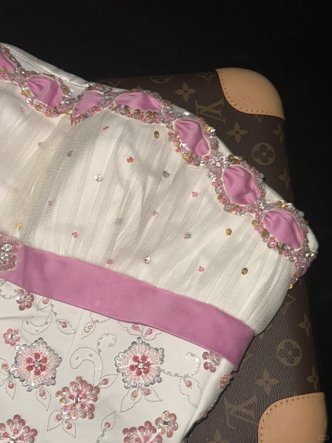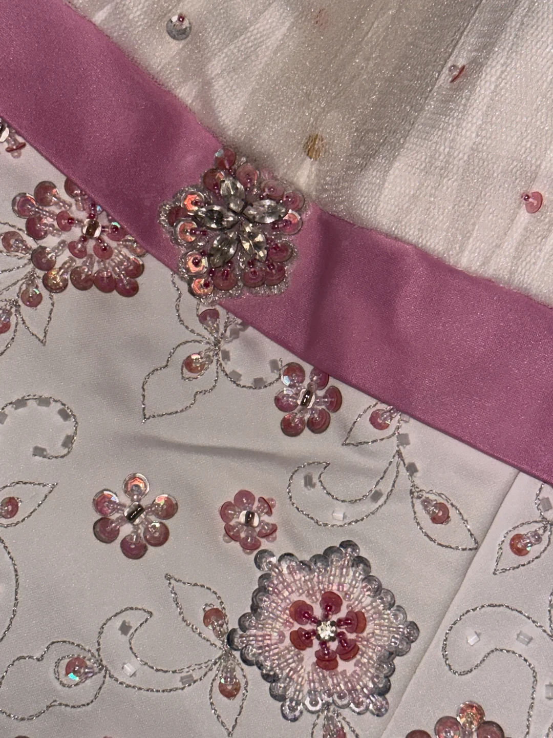 Vintage A Line Strapless Pink Beaded White Satin Tulle Long Prom Dress DP4424