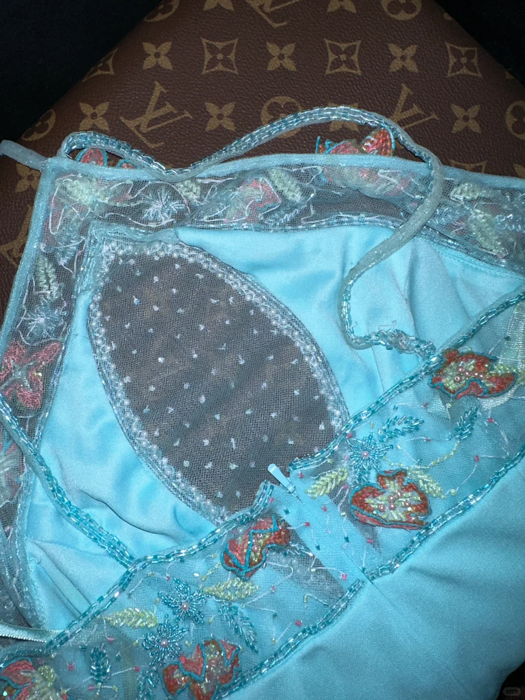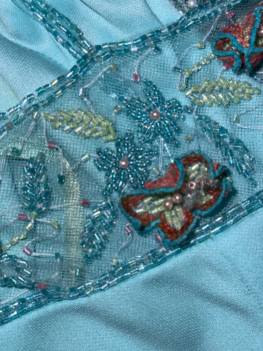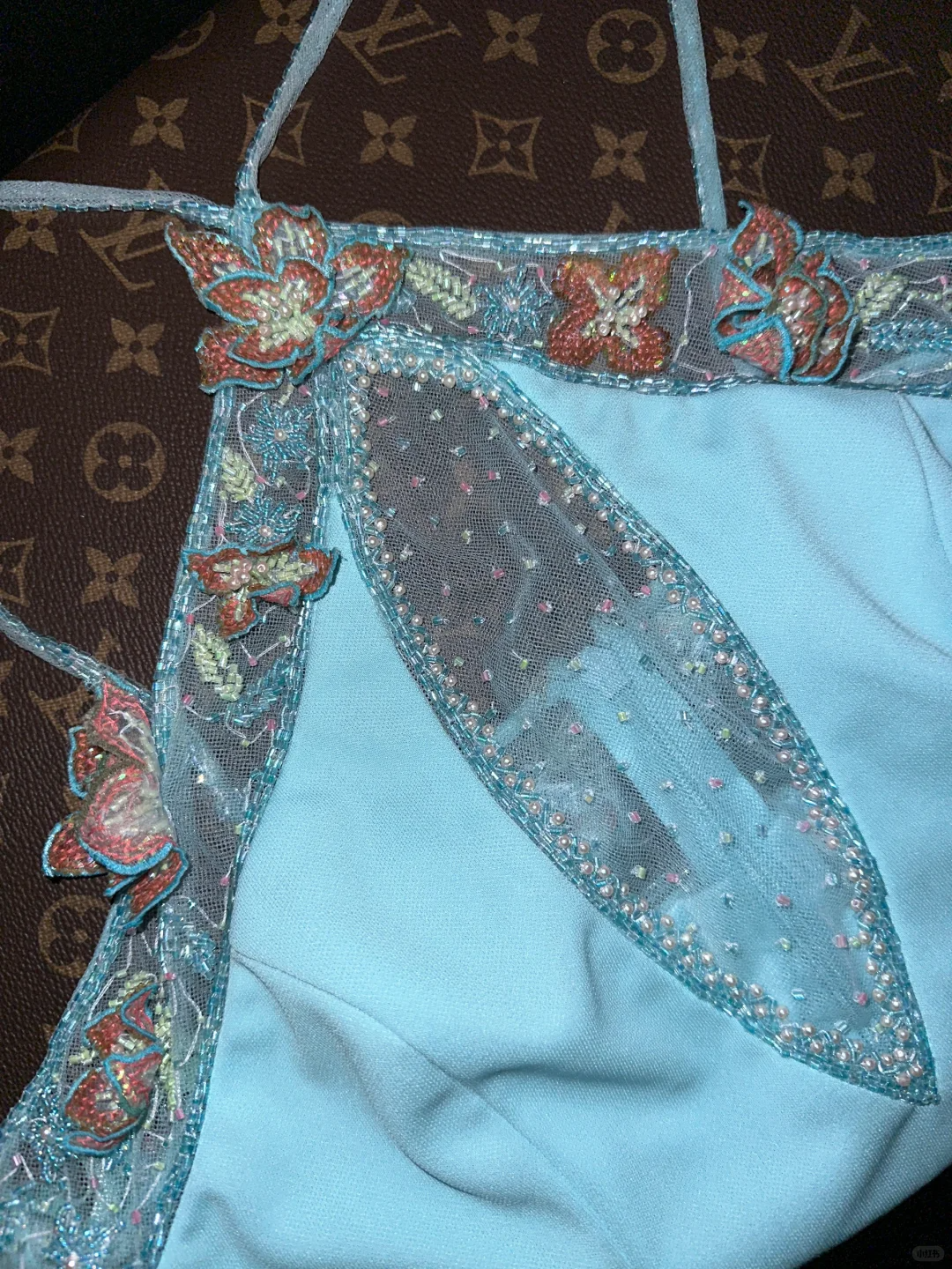 Vintage Mermaid Halter Beaded Blue Satin Long Prom Dress DP4421